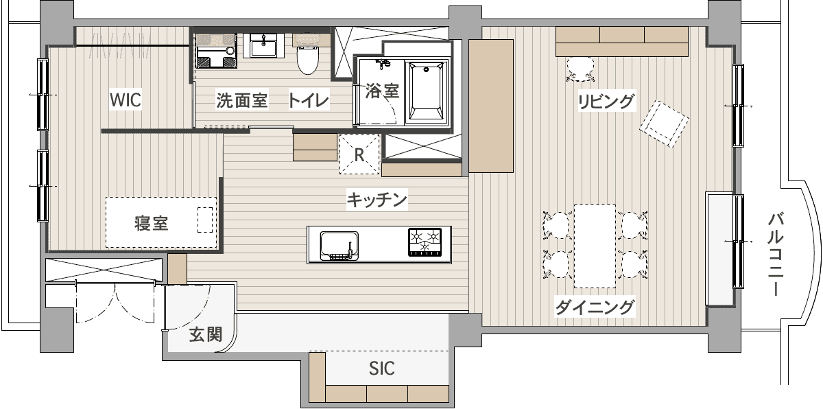 キッチン周りを中心に、回遊できるレイアウトが気に入っています。