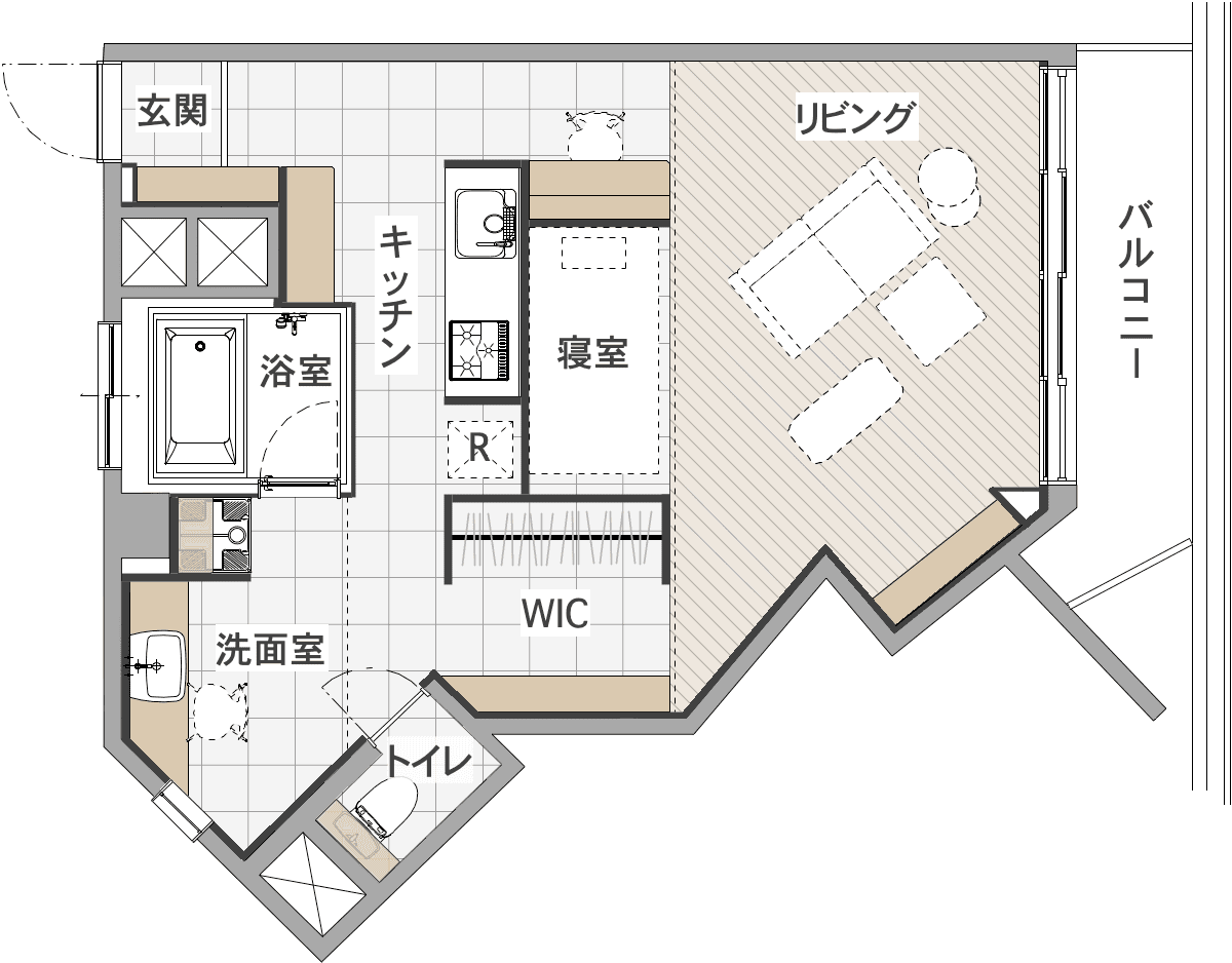 広々としたリビングで、ソファとベッドの両方からテレビが見える設計が魅力です。最小限の間仕切りで回遊性を確保し、バーチカルブラインドで風通しとプライバシーを両立。白を基調とし、丸みを帯びた照明や洗面ボウルが柔らかな雰囲気を演出する空間となりました。