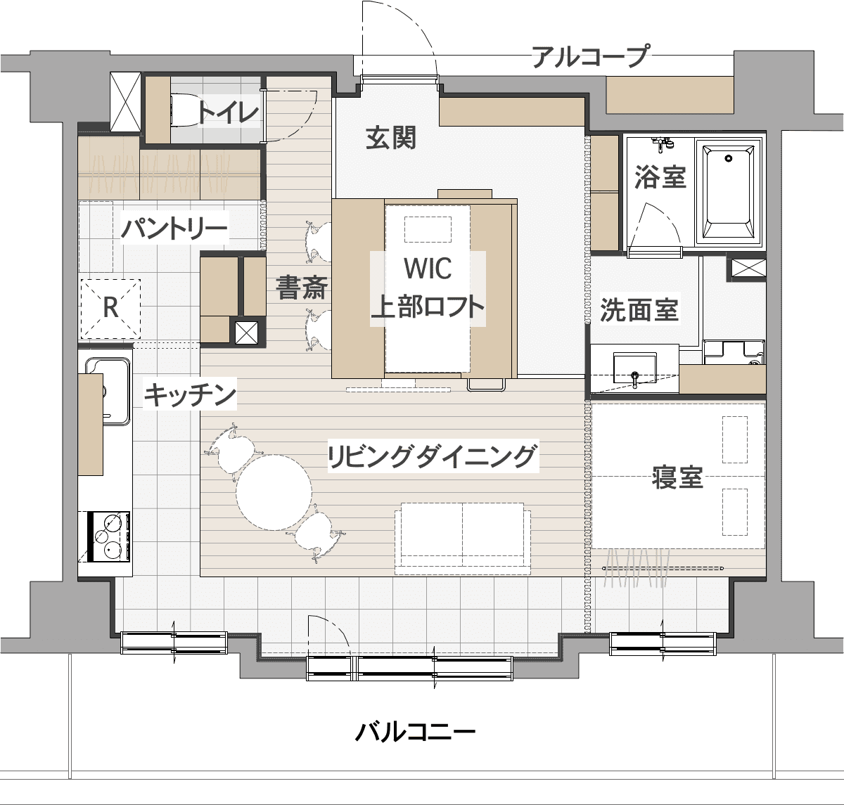 コンクリート打ちっぱなしが際立つ空間にロフトを設置。ロフトは壁掛けテレビ、WIC、ワークスペース、ロフトベッドを兼ねる。家電はパントリーに収納し、すっきりしたキッチンがリビングダイニングと一体化。無垢材のウッドワンキッチンが調和するリノベーションになりました。