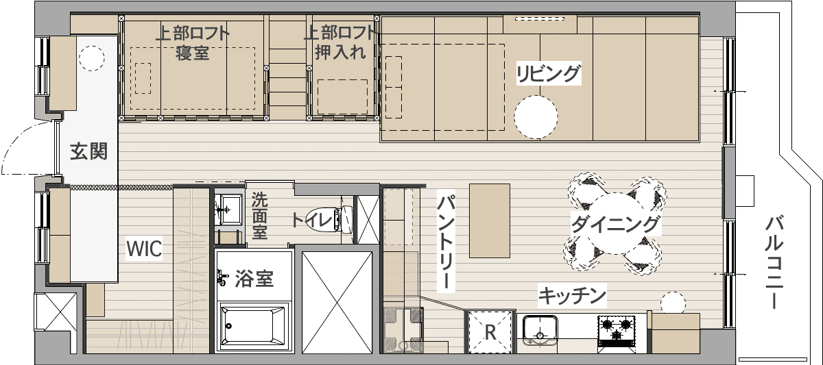 <ご主人>面白かったです。 <奥さま>このプランになる前、自分たちの要望をおうちプランナーさんに伝えて形にしてくださいました。でも「おうちプランナーさんだったらどうするか」を提案していただきたくて、お願いをしました。そのうちの1つが今のプランになっています。自分たちにはない発想で、結果的によかったです。 <ご主人>その中にも我々のやりたいことを落とし込んでくれました。 Q.叶えたかったのはどの辺りですか? <ご主人>ロフトと畳ですね。 <奥さま>あと主人がとり入れたいと言っていた土間も。ロフトもはしごではなく階段にしたかった。「階段があるとワクワクするんですよね」と言ったら、「そのワクワク感は大事です」と後押ししてくれました。収納も家具を置きたくないので「とにかく棚は造りつけにしてくれ」と言って、いろんなところに棚がついたのはおうちプランナーさんの提案でした。前に住んでいた賃貸物件でも物を箱に収納していることをおうちプランナーさんに伝えたら、「暮らし方のエッセンスの1つだと思う」と言って活かしてくれました。