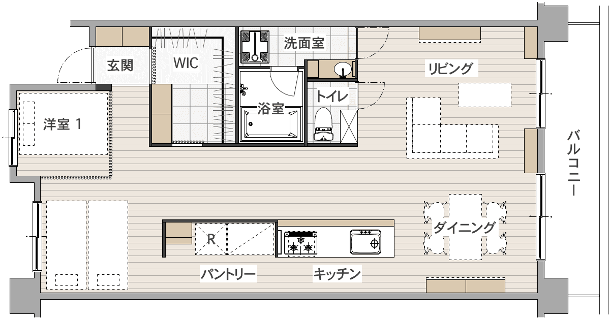 回遊性のあるパントリー付きアイランドキッチン/水回りとWICを一つの箱にまとめ、あとはだだっ広い空間に/アーチ型の開口、ブラケット照明、青い黒板壁が空間のアクセントに