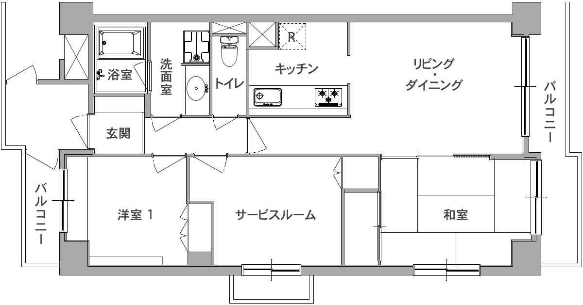 大きなワンルームをゆるやかに仕切り、家族の気配が感じられる住まいに。間仕切りには大小の開口部を設け、光と風をまわしつつ視線をコントロール。空間のアクセントになる長いインナーバルコニーは廊下に見立てることもでき、視線が心地よく抜ける動線として機能します。