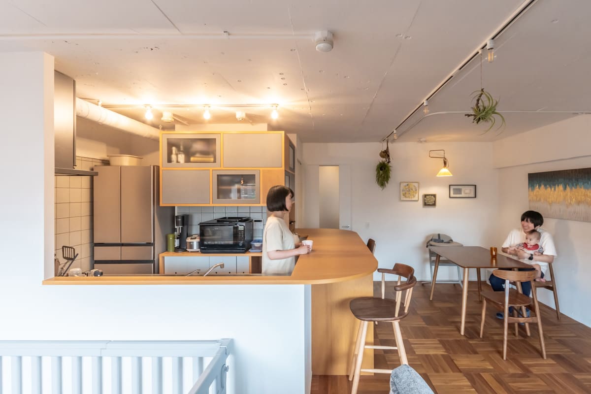 「木造校舎のような懐かしい雰囲気」がデザインテーマのお住まい。パーケットフロアをベースに、キッチンまわりには柔らかいフォルムや色合いの造作を施し機能性と優しさを。個室にはグレーの室内窓をアクセントにしつつ、室内全体に風と光が巡る設計にしています。