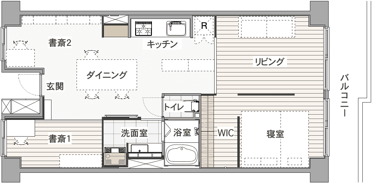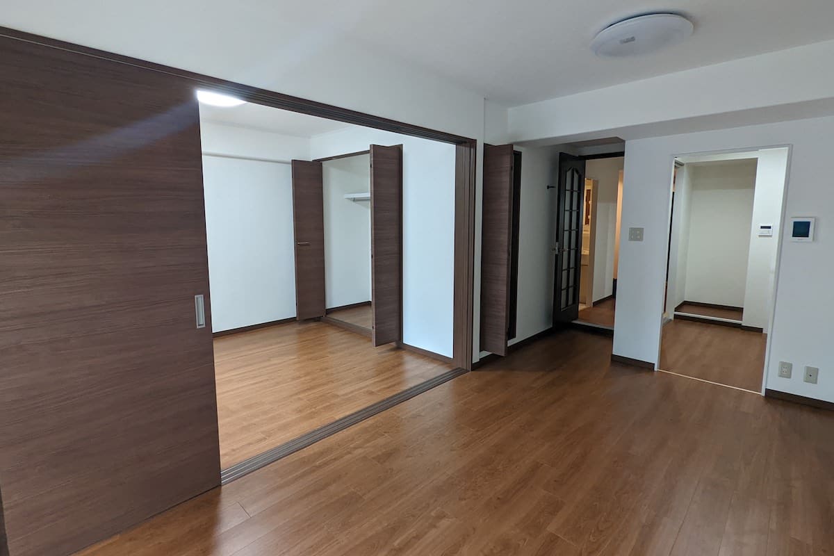 <ご主人> 古書のオンライン販売を副業として行なっているので、商品となる本を中心にやりたいことを掛け合わせていきました。 昔の駄菓子屋さんや煙草屋さんのような、広い土間に商品が並んだ先に住空間があるようなイメージをお伝えして、その中でも仕事とプライベートを切り替えられるようにしたい、ということをお願いをしました。 あとは、FPさんに算出していただいた安心予算ギリギリではなく、だいぶ下回るようプランニングしていただきました。 Q.プランナーはどのようにして応えましたか? <ご主人> リビングや寝室などのリラックスする場所はフローリング、家事や仕事をする場所は床を作らず解体したままにして、床の段差と仕上げで気分を切り替える案をいただきました。 キッチンやお風呂、トイレは、リノベーション済みの新しいものを再利用したり、壁もクロスを張り替えるのみにしたことで予算を大幅に下回るようにしてくださったんです。 <奥さま> 以前の住まいから使っていたチェストや全身鏡の写真を見ていただき、その家具と合う床材を提案してくださいました。 可愛くて気に入っていたのに既存の賃貸物件ではなかなか合わなかったのが、グッと素敵になりました。 <ご主人> 古本屋やギャラリーに行くことが好きで、持ち帰った本も作品も前の住まいではしまいこんでいたり、壁に掛けたいけど合わないなど、持て余してしまっていたので、好きな本や作品を飾って楽しめるよう、壁を白くしたりライティングレールでスポットライトを当てられるようにしていただいています。